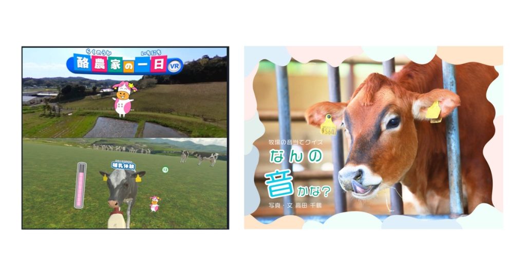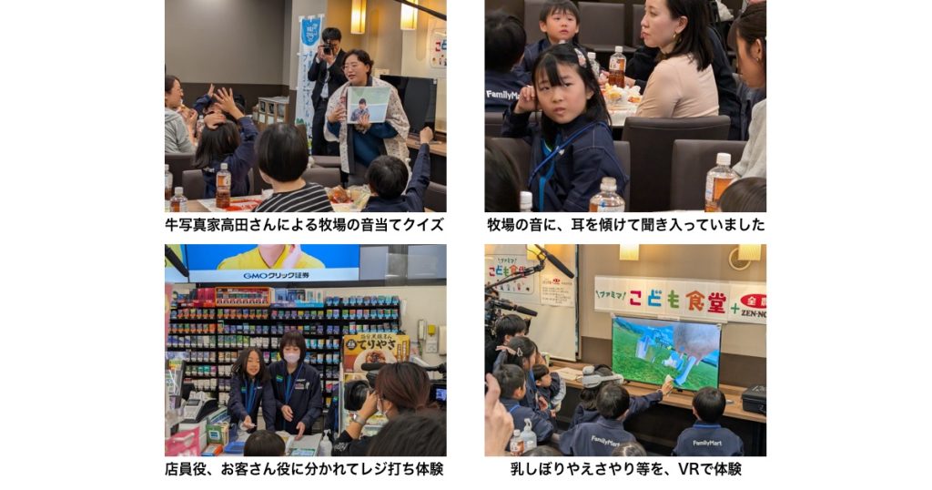 初回開催では、関東生乳販売農業協同組合連合会協力の元、VRゴーグルを使って牧場の様子を臨場感のある映像で観察、酪農の仕事をゲーム形式で学びました(初回開催のみ)。 さらに、牛カメラマンの高田さんに撮影・制作いただいた紙芝居『牧場の音当てクイズ なんの音かな?』では、牧場のさまざまな音を聞いてもらい、何の音かを想像しながら音当てクイズを実施。耳を使って、楽しく酪農について学んでもらいました。なお、参加されたおこさまとご家族の皆さまには「ファミマの牛乳 500ml」を1人さま1本プレゼント。音当てクイズと、牛乳のプレゼントは2回目以降も全国で実施されます。
